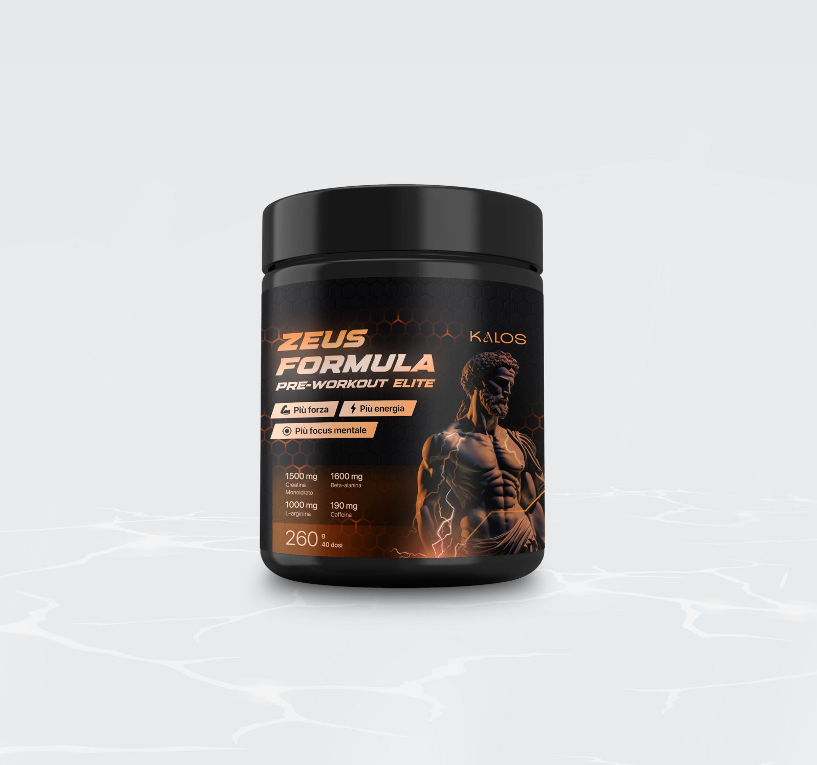 Il nostro pre-workout, Zeus Formula, sfrutta una combinazione unica di ingredienti studiati: di beta-alanina, creatina, L-arginina, L-tirosina e caffeina. Premettondo di allenarti con più energia, forza e resistenza.